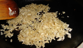 • Fry the raisins in the same pan until they're puffed and golden. Remove from ghee and reserve with cashew nuts.