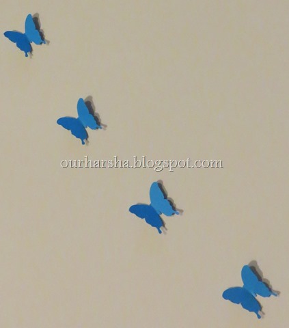Here I did a simple decoration with blue cardstock paper cutout butterflies and placed it on wall in a specific manner. ( See below pictures)