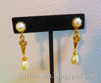 Now insert the other end of Gold plated flat cable chain (one end is attached with the cup shaped paper Jhumka ) in the ear stud post. Advantage of this method of Jhumka making is, you can wear stud alone if you wish or both the stud and hangings together as traditional Jhumkis. (Separating and joining together the ear stud and hanging is easy according to your occasions and dresses).