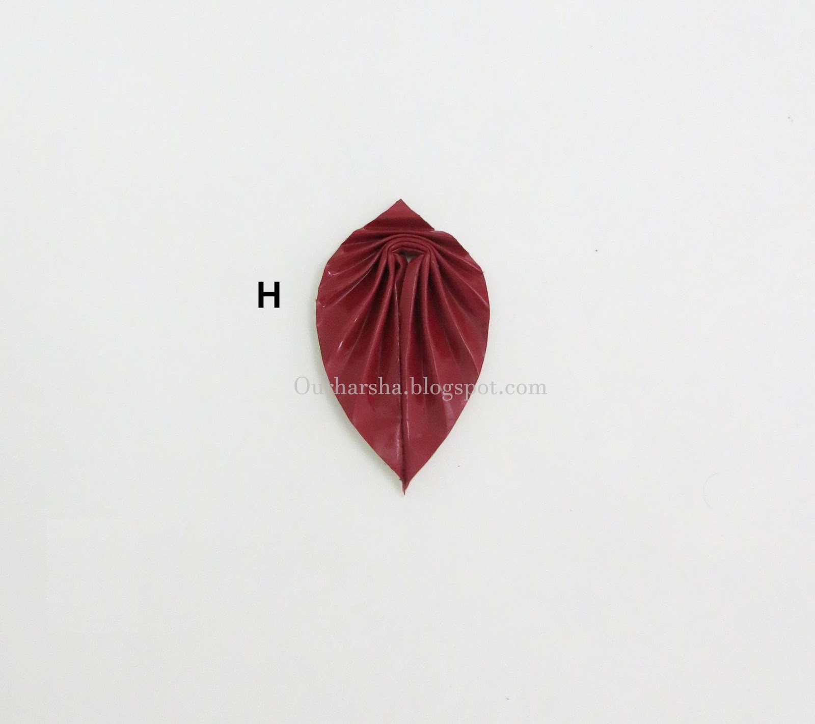 ഇനി ഇതിനെ ചിത്രം F, G എന്നിവയില് കാണുന്നത് പോലെ രണ്ടായി മടക്കി,ചിത്രം G യില് കാണിച്ചിരിക്കുന്നത് പോലെ അകവശത്തെ അടുത്തടുത്തുള്ള പ്ലീറ്റുകളില് മാത്രം ഗ്ലൂ ചെയ്തു, അവയെ തമ്മില് യോജിപ്പിക്കുക. ഗ്ലൂ ചെയ്യുമ്പോള് ചിത്രം G യില് ഒരു വര വരച്ചിരിക്കുന്നത് ശ്രദ്ധിക്കുക. ഇലയുടെ മുകളില് നിന്ന് അല്പം സ്പെയ്സ് വിട്ടു വേണം ഗ്ലൂ ചെയ്യേണ്ടത്. ഒറിഗാമി പേപ്പര് ലീഫ് റെഡി (ചിത്രം H).